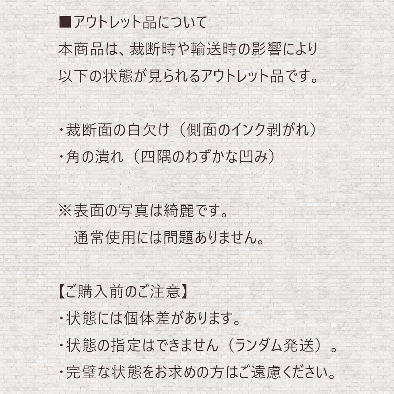 芸妓さん・舞妓さんのポストカード(アウトレット品/同柄2枚セット)です。 比較的最近まで現役だった方、または現在も現役としてご活躍中の方を、カメラマンの久観さまが撮影されました。 以下の9種類からお選びいただけます。 A:芸妓 とし真菜 さん B:舞妓 叶久 さん C:舞妓 叶久 さん / 芸妓 まめ藤 さん D:舞妓 佳つ春 さん ① E:舞妓 佳つ春 さん ② F:芸妓 紗矢佳 さん G:舞妓 千賀遥 さん H:舞妓 秀真衣 さん I:舞妓 亜佐子 さん ■本商品の重要なお知らせ 昨今の状況の変化により、芸舞妓さんの新しいポストカードを製造することが叶わなくなりました。 本品は、当店が大切に扱ってきた「最終生産分」の在庫となります。 ■アウトレットの理由(必ずご確認ください) 本商品は、印刷会社からの納品時より以下の状態が見られる「アウトレット品」です 。 当店の正規品としての販売基準には満たないと判断したものですが、カード表面の写真は綺麗であり、Postcrossing等での通常使用には問題ないため、お得な同柄2枚セットとしてご提供いたします 。 ・裁断面の白欠け 印刷会社での裁断時に、カードの端(側面)のインクが剥がれ、地の色(白)が見えている箇所があります。 ・角の潰れ(角打ち) 輸送・保管時に生じた、四隅のわずかな凹み。 【ご購入時の注意点】 ・ダメージの程度や箇所には個体差があり、商品ごとに異なります。 ・損傷の程度をお選びいただくことはできません。ランダムでの発送となりますので、あらかじめご了承ください。 ・完璧な状態のカードをお求めの方や、神経質な方はご購入をお控えいただけますようお願い申し上げます。 《商品情報》 サイズ:100×148mm(一般的なポストカードのサイズ) 用紙:両面コート紙 360kg(Aのみ両面コート紙 265kg/0.320mm) ・1枚の厚さ:0.4300mm(参考:官製はがき 0.2〜0.22mm) ・海外発送に耐えられるコシのある丈夫な紙です。 ・光沢のある用紙でツルツルとした手触りです。 鉛筆:× 油性ペン:〇 水性ペン:× ボールペン:△ 印刷:オフセット印刷(280線) 販売単位:1セット(同柄ポストカード2枚) 《必ずご確認下さい》 •お使いの端末や閲覧環境により、写真と実物の色味や質感が多少異なって見えることがございます。 • 表示価格は本体(1セット / 同柄ポストカード2枚)価格(税込)です。配送料が別途必要となります。 気になる点がございましたらお気軽にお問い合わせ下さい。