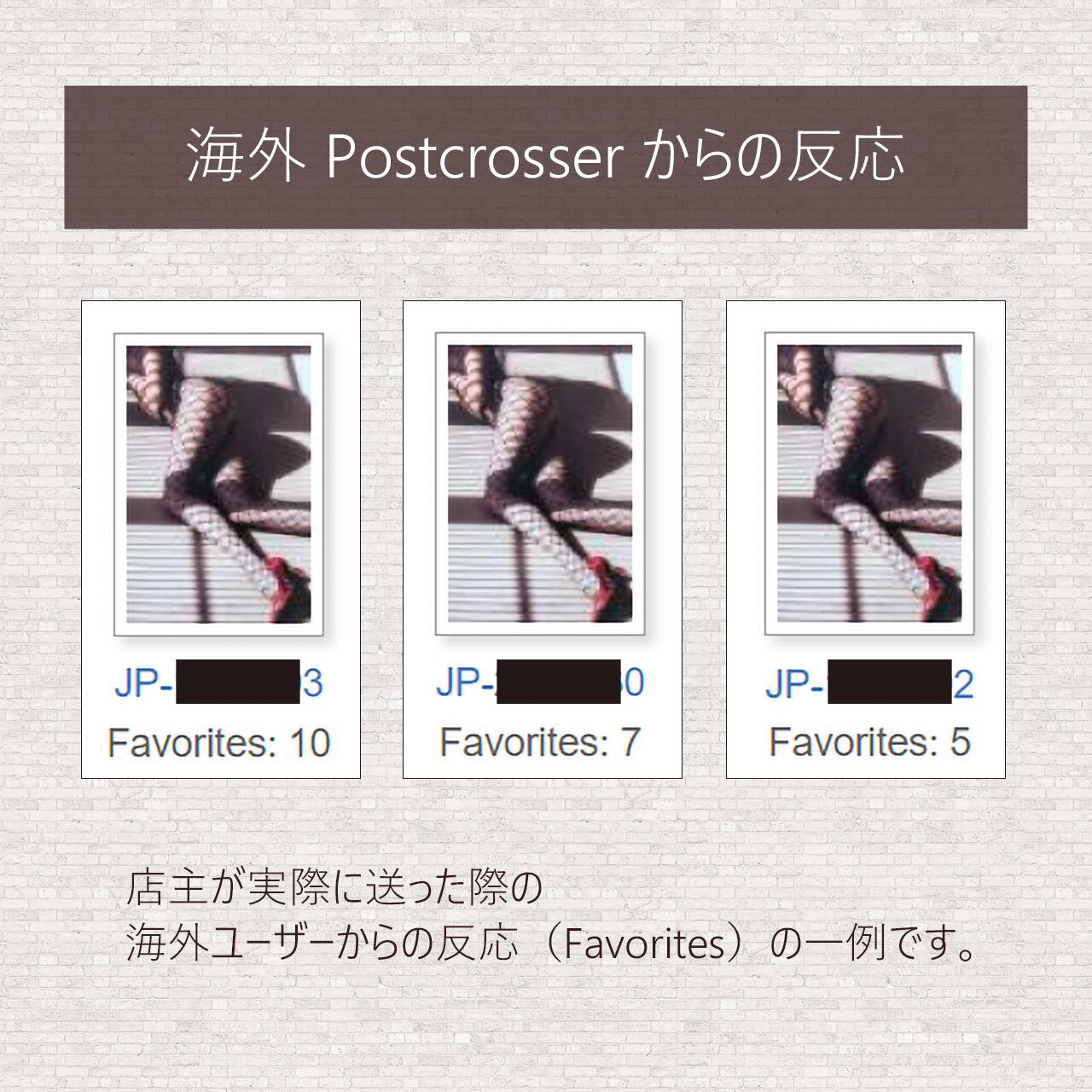 店主が実際に送付した際の反応(Favorites数)を、商品写真の最後に掲載しています。カード選びの参考にご参照ください。